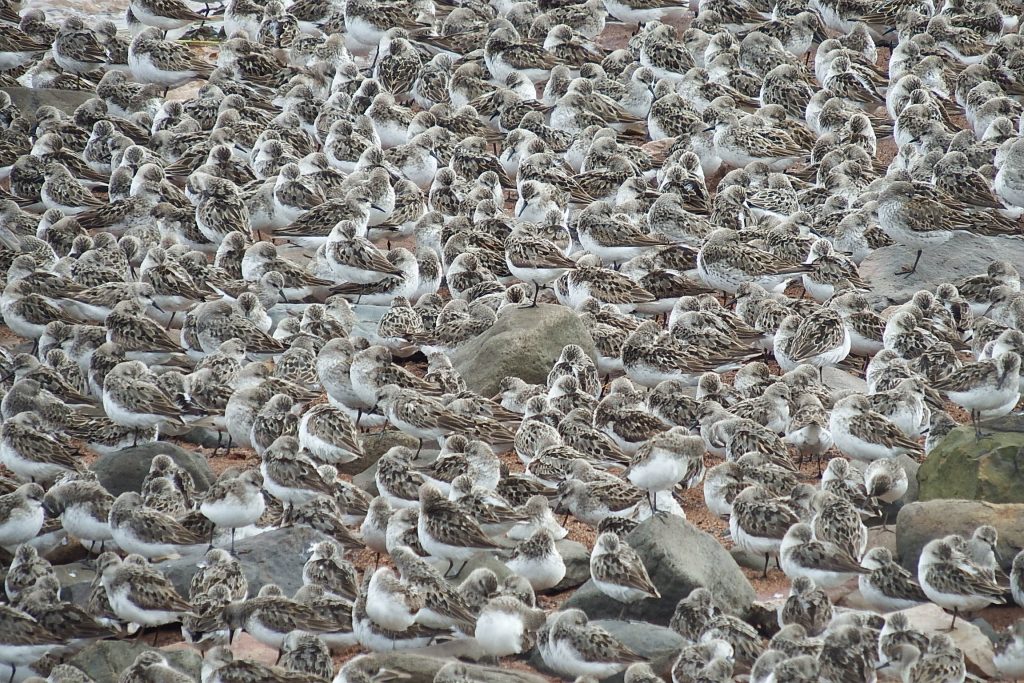 Since 2017, Space to Roost has focused on reducing human-caused disturbances at stopover sites for Semipalmated Sandpipers in the inner the Bay of Fundy of Nova Scotia. The Southern Bight, Minas Basin KBA is globally significant for Semipalmated Sandpipers, supporting tens of thousands of these sparrow-sized shorebirds during peak migration in August. “Semis” migrate along the Atlantic Flyway from their Arctic breeding grounds all the way to South America to spend the winter. The Bay of Fundy is their last pit-stop before a continuous, three-day flight over the Atlantic Ocean. They must double their body weight to have enough energy to survive, which requires ample food and rest. Starting about two hours before peak high tide, thousands of “Semis” and other shorebirds gather in dense flocks to rest on coastal beaches in the KBA. Shorebird rest time ends about four hours later – when the tide recedes and exposes mudflat foraging habitats again. To ensure these migratory superheroes have safe and calm spaces for resting, Space to Roost asks beach users to avoid a section of beach, called the “shorebird resting beach”, during August rest times.