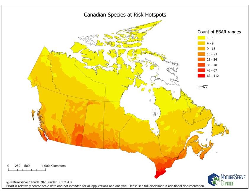 The NatureServe Canada EBAR team released a Hotspot Map that summarizes the number of EBAR species ranges (from a total of 477 published ranges included in the analysis) that intersect each Ecoshape. See image of the Hotspot Map provided and visit: https://www.natureserve.org/canada/ebar to learn more and to access the GIS data and additional documentation.